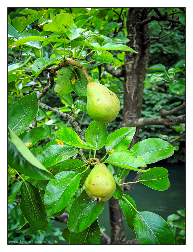 Nachdem der Birnbaum letztes Jahr alle Früchte schon im Frühstadium verloren hatte, freut es mich sehr, dass sie heuer wieder heranreifen. Die rostgelben Flecken auf den Blättern waren 2020 überall. Ob die Kleingärtner bei der Genesung nachgeholfen haben, oder ob das Bäumchen das alleine geschafft hat, weiß ich (noch) nicht.